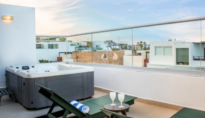 DEVA es un complejo moderno y original, es el resultado de la fusión entre naturaleza, lujo y confort. Este espacioso Penthouse de dos niveles de 2,638.65 pies cuadrados está ubicado en la zona más exclusiva de Palya del Carmen, a solo una cuadra del mar y cerca de todos los restaurantes de la famosa Quinta Avenida. En el primer nivel cuenta con 3 recámaras cada una con su baño, amplios closets, cocina equipada, área de lavandería y una amplia sala, comedor y amplia terraza. Sistema de iluminación led, minisplits en todas las áreas y persianas black out en las recámaras. En la parte superior tiene un cómodo roof top con un pequeño bar, jacuzzi, baño y bodega. Esta azotea conecta directamente con la piscina del condominio. COMODIDADES: * Piscina * Techo * Bar * Seguridad las 24 horas * Ascensor * Estacionamiento